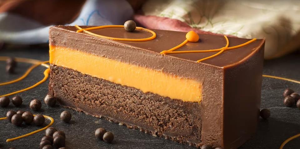 Sipajte smjesu u pripremljen pleh i pecite na 180°C 25 – 30 minuta. Izvadite patišpanj iz rerne i izravnajte gornji dio zadnjom stranom kašike, dok je još vruć. Ostavite da se potpuno ohladi. Za fil od narandže prvo pripremite želatin. Zagrijte slatku pavlaku, pa u nju dodajte želatin. Miješajte dok se želatin ne rastopi. Prelijte smjesu preko bijele čokolade i promiješajte da se rastopi, pa dodajte narandžastu boju za hranu.