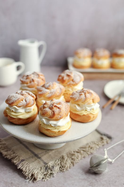 Na donji deo krofne najpre istiskujte kremu, a potom i šlag i svaku krofnu poklopite poklopcem.