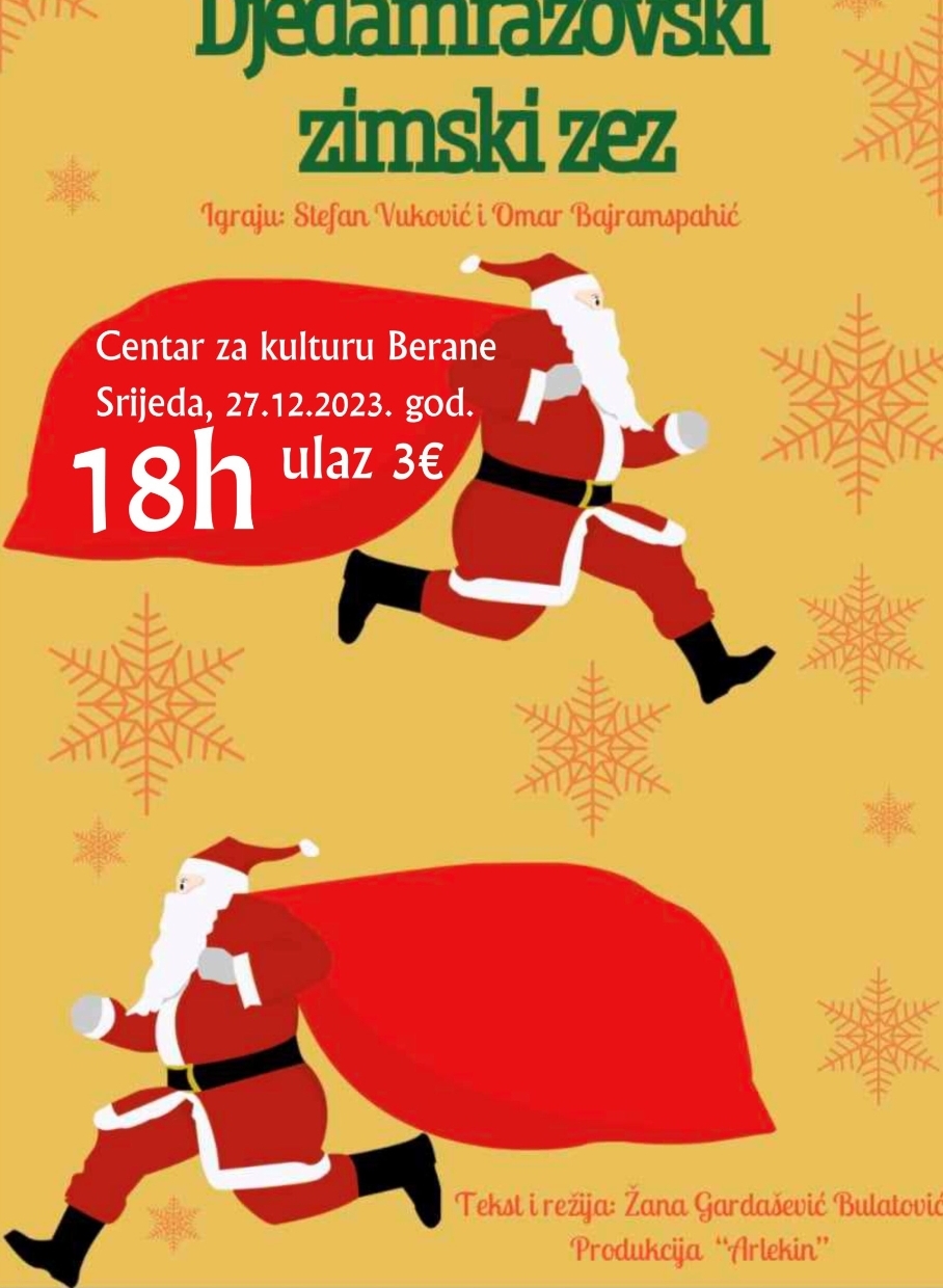 Na sceni Centra za kulturu u Beranama u srijedu, 27. 12. 2023. godine u 18 sati, biće izvedena novogodišnja pozorišna predstava za djecu “Djedamrazovski zimski zez“.
