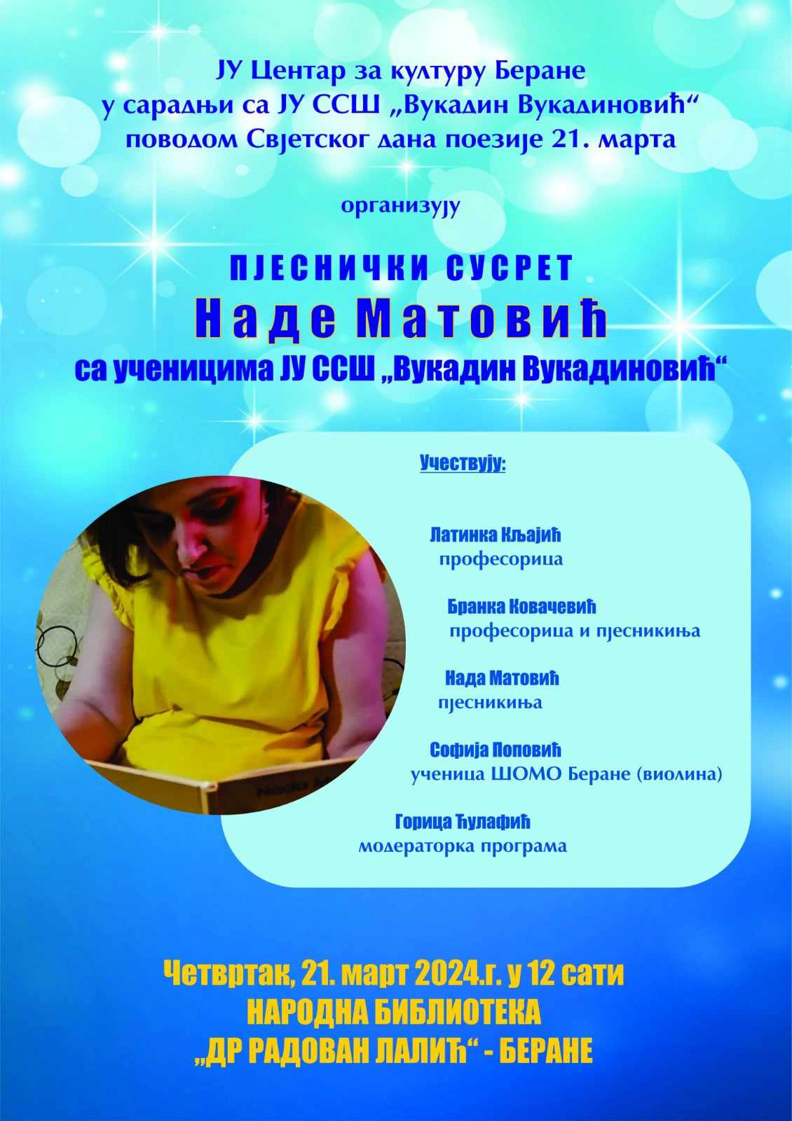 Susret će se održati u galeriji Narodne biblioteke “Dr Radovan Lalić”, a početak je zakazan za 12 časova. Program se odvija u saradnji sa Srednjom stručnom školom “Vukadin Vukadinović”. Osim Nade Matović, učestvuju i učenici muzičke skole kao i profesori Latinka Kljajić, Branka Kovačević i moderatorka programa Gorica Ćulafić.