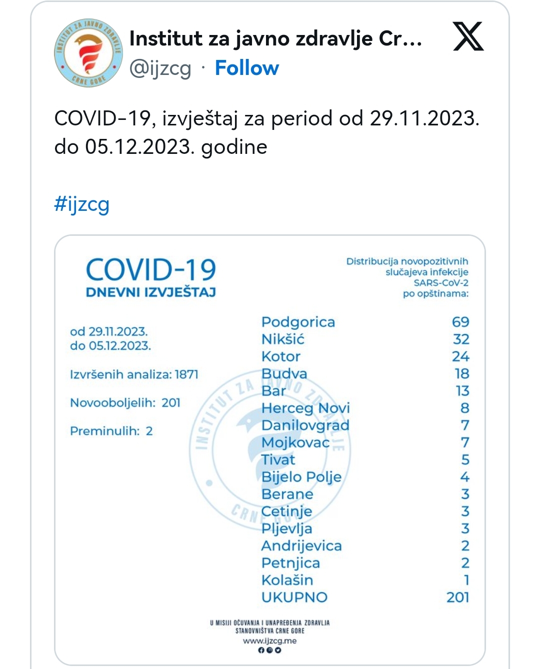 Iz Instituta za javno zdravlje (IJZ) saopšteno je da su njihove i druge javne i privatne laboratorije, koje se bave dijagnostikom infekcije koronavirusom, od srijede do utorka završile analizu i dostavile rezultate za 1.871 uzorak.