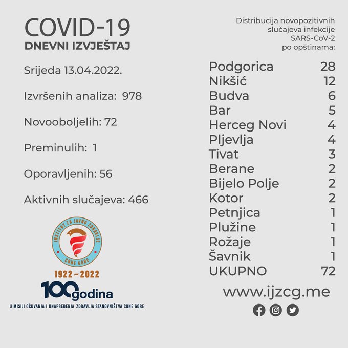 Oporavilo se još 56 pacijenata, dok je trenutno oboljelih u Crnoj Gori 466.