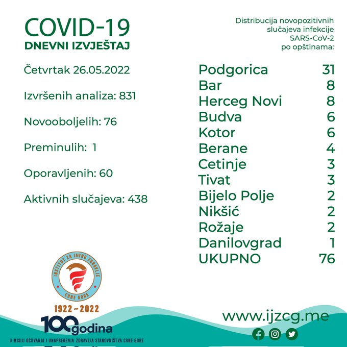 U Crnoj Gori u posljednja 24 sata, prijavljen je jedan smrtni slučaj od posljedica infekcije, dok je registrovano 76 novih slučajeva koronavirusa, saopšteno je iz Instituta za javno zdravlje (IJZ).