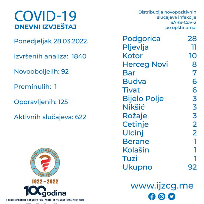 Novootkriveni slučajevi su iz Podgorice 28, Pljevalja 11, Kotora deset, Herceg Novog osam, Bara sedam, Budve i Tivta po šest, Bijelog Polja, Nikšića i Rožaja po tri.