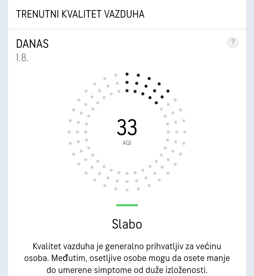 Kvalitet vazduha je generalno prihvatljiv za većinu osoba.