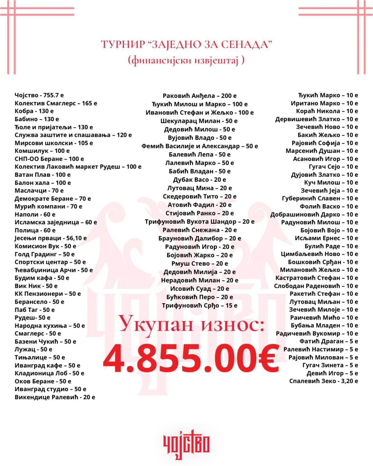 Na humanitarnom turniru u malom fudbalu “Zajedno za Senada“ prikupljeno je 4.855 eura koje su uplaćene za liječenje našeg teško povrijeđenog sugrađanina Senada Muratovića.