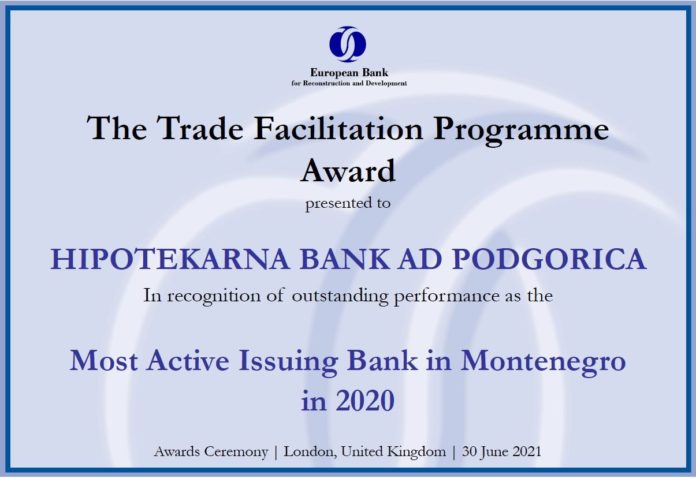 EBRD je, u okviru svog Programa olakšavanja trgovine /Trade Facilitation Program/ (TFP), dodijelila nagrade za prošlu godinu najuspješnijim partnerskim bankama, a na crnogorskom tržištu Hipotekarna je u okviru tog programa prepoznata kao najaktivnija.