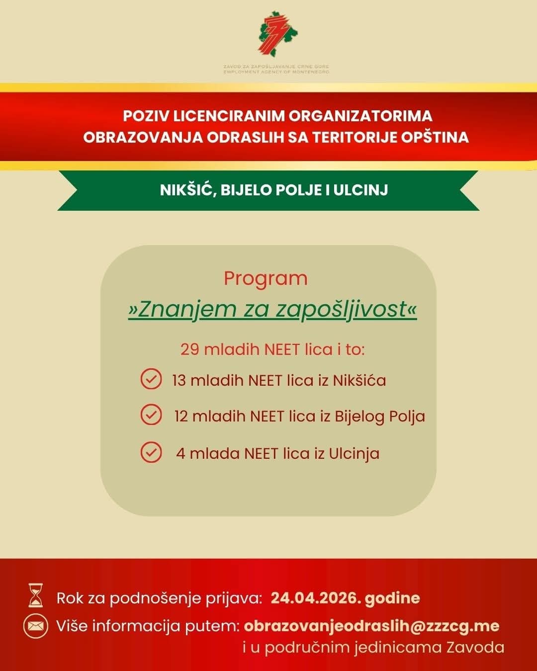 Zavod za zapošljavanje Crne Gore objavio je javni poziv licenciranim organizatorima obrazovanja odraslih iz Nikšića, Bijelog Polja i Ulcinja za učešće u realizaciji programa “Znanjem za zapošljivost”, koji se sprovodi u okviru Garancije za mlade 2024 – 2026.