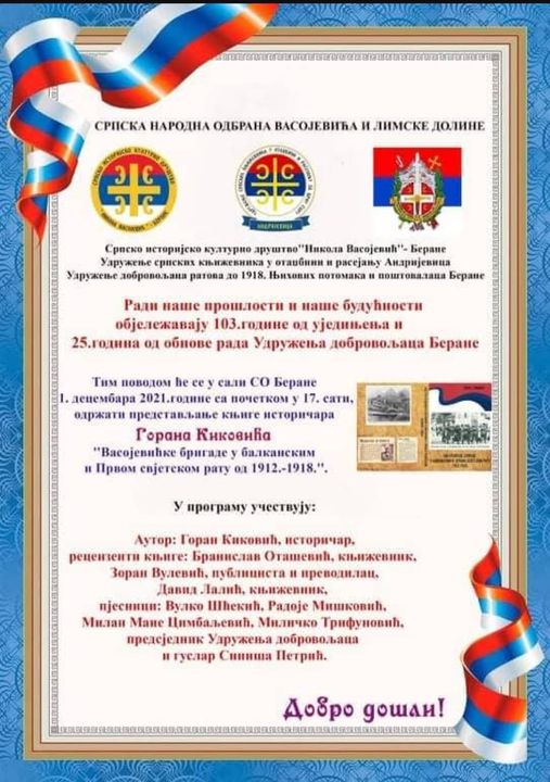 U organizaciji Srpsko istorijskog kulturnog društva “Nikola Vasojević” iz Berana, Udruženja srpskih književnika u otadžbini i rasejanju iz Andrijevice i Udruženja dobrovoljaca ratova do 1918. njihovih potomaka i poštovalaca Berane, biće obilježeno 103 godine od ujedinjenja i 25 godina od obnove rada Udruženja dobrovoljaca Berane.