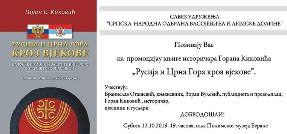 Savez udruženja “Srpska narodna Odbrana Vasojevića i limske doline” organizuje promociju knjige istoričara Gorana Kikovića, pod nazivom “Rusija i Crna Gora” kroz vjekove.