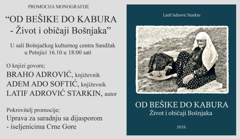 U sali Bošnjačkog kulturnog centra Sandžak u Petnjici, 16. 10. ove godine održaće se promocija monografije “Od bešike do kabura – život i običaju Bošnjaka” autora Latifa Adrovića.