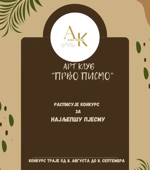 Art klub “Prvo pismo” raspisuje konkurs, pod nazivom “Poezija bez granica”, za najljepšu pjesmu, koji traje do 8. septembra. U objavi konkursa navedeno je da je tema slobodna i da mogu konkurisati “svi, koji vole da pišu i bilo gdje da žive”.