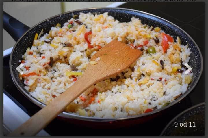 Pred kraj, dodajte so, biber i mljevenu crvenu papriku. Odložite povrće sa strane u tiganju. U medjuvremenu, pirinač je verovatno pri kraju, pa ga ocijedite i ponovo isperite hladnom vodom, da zaustavite proces kuvanja. Ostavite ga sa strane. Pripremite jaja. Ulupajte jaja viljuškom, dodajte dva prstohvata soli i 1/4 kašičice belog bibera. Promiješajte. Sipajte jednu kašiku maslinovog ulja u manji tiganj i uključite da se grije na srednjoj jačini temperature. Kada je spremno, ne prevruće, ulijte jaja. Ispecite ih dosta često miješajući, kako biste dobili kajganu. Kada je gotovo, odložite sa strane. Na povrće dodajte pirinač, promiješajte, pa vratite da se sve zajedno proprži još nekih 5 minuta. Nakon toga, umiješajte i jaja u pirinač i povrće, pa još nekih minut sve zajedno pržite. Nakon toga, sklonite sa ringle i vaš ručak je spreman. Prijatno!