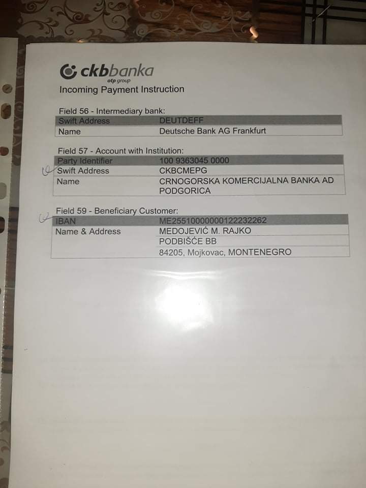 Svi ljudi dobre volje i koji to mogu donacije mogu uplatiti na broj računa: Rajko Medojević CKB BANKA 51022049702830157