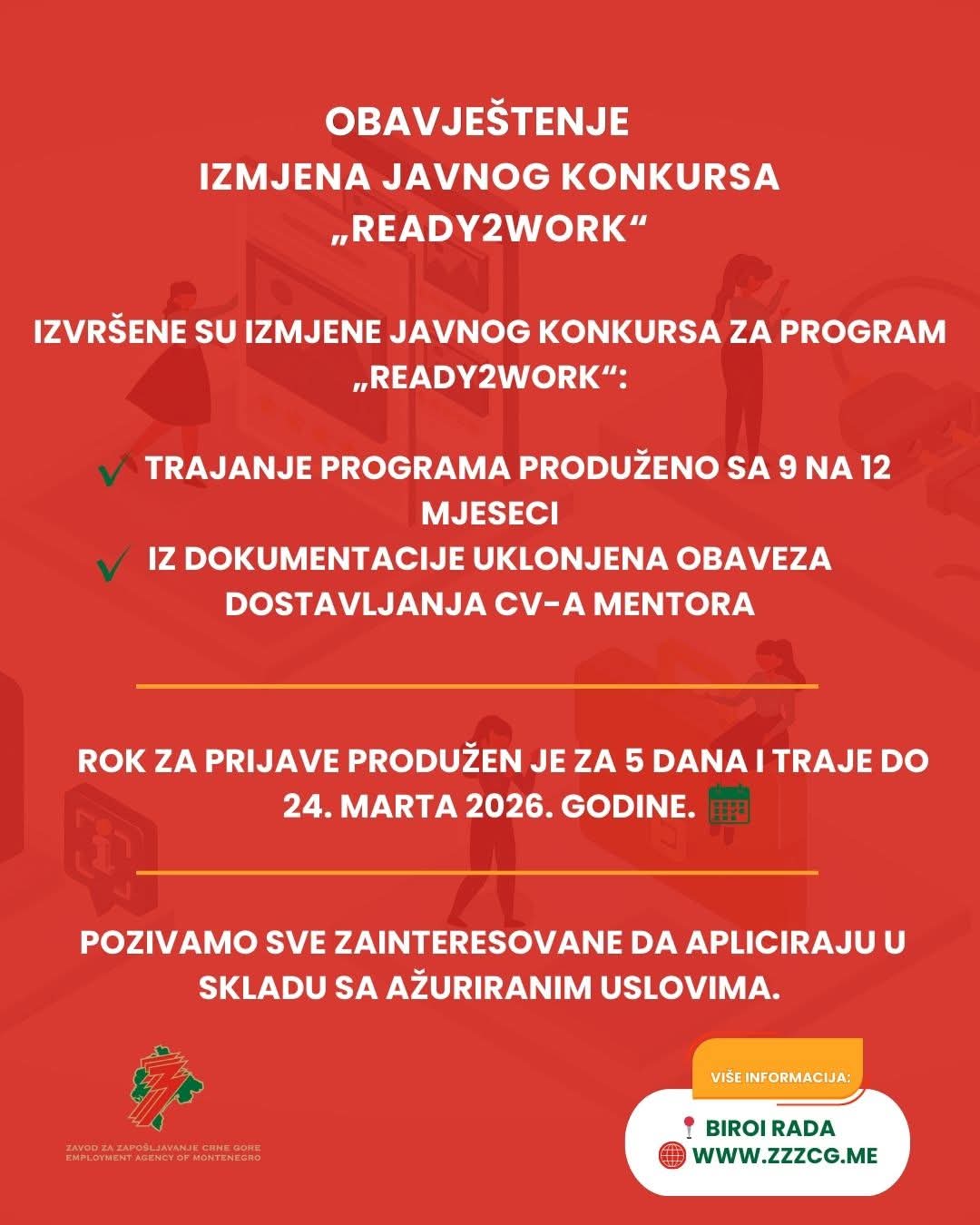 Zavod za zapošljavanje Crne Gore obavještava da su izvršene izmjene Konkursa za realizaciju programa osposobljavanja korisnika materijalnog obezbjeđenja “Ready2Work”, namijenjenog sticanju prvog radnog iskustva.