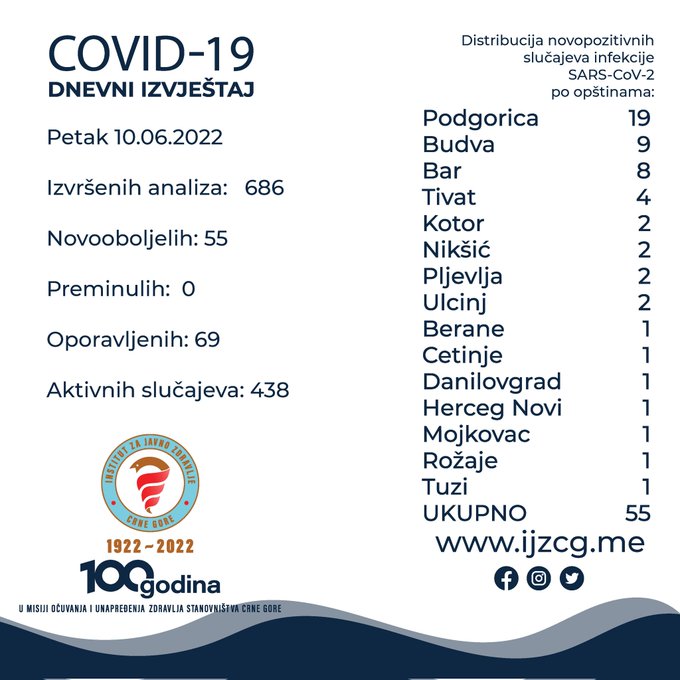U Crnoj Gori, u posljednja 24 sata, registrovano je 55 novih slučajeva infekcije koronavirusom.