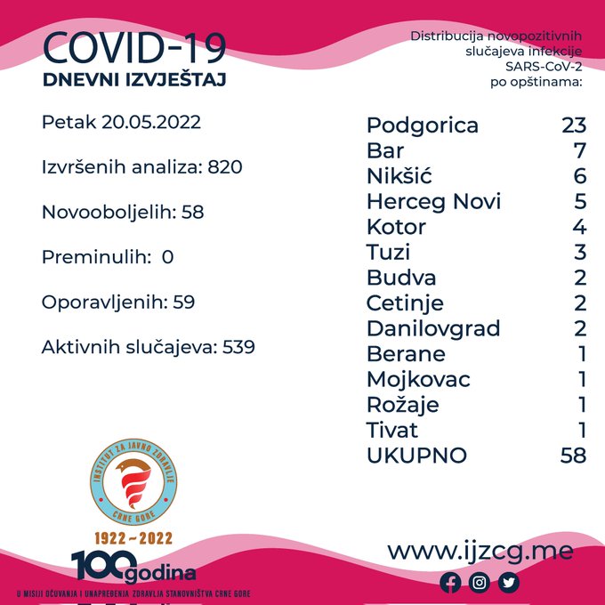 U Crnoj Gori u posljednja 24 sata, nije prijavljen nijedan smrtni slučaj od posljedica infekcije, dok je registrovano 58 novih slučajeva koronavirusa, saopšteno je iz Instituta za javno zdravlje (IJZ).