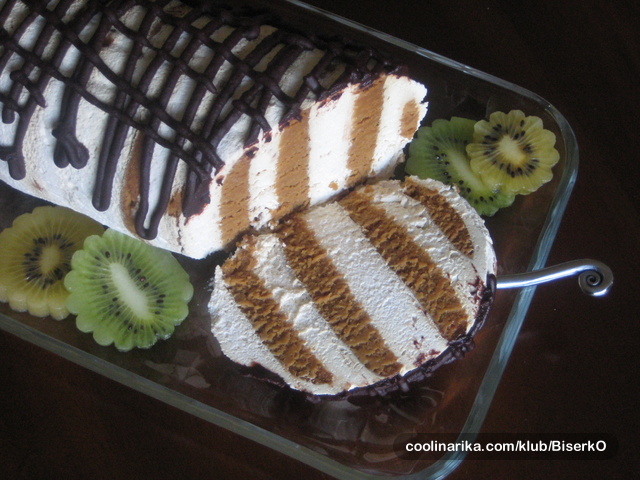 Obložite kalup plastificiranom folijom. Keks slažite uspravno , namažite kremom, preklopite drugim i tako naizmjenično pet puta. Prenesite ih u kalup. Postupak ponavljajte sve dok ne utrošite materijal.