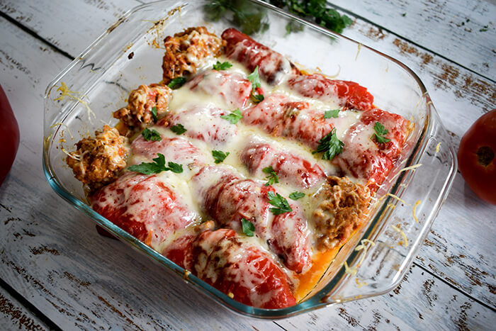 Izdinstajte crni luk na malo ulja. Možete dodati i vrlo malo vode u luk koji se dinsta. Kada je luk dobio lijepu zlatnu boju dodajte pardajz koji ste prethodno isjeckali na sitne kockice. Kada se paradajz prodinsta sa lukom dodajte mljeveno meso i začine po ukusu. Prodinstajte sve to dok meso ne posiivi a zatim ugasite ringlu i ostavite par minuta da se prohladi. Dodajte zatim jedno jaje i dve supene kašike prezle. Promiješajte sve pa rukama formirajte kuglice. Stavljajte ih u papriku koju je potrebno smotati u rolnicu. Poređajte u vatrostalnu činiju ili pleh pa narendajte malo Gaude ili nekog sira po želji. Ubacite u rernu na nekih desetak minuta da se sir lijepo otopi i porumeni.