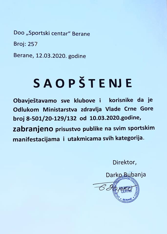 Sportski centar Berane izdao je zvanično obavještenje za sve klubove i korisnike da je zabranjeno prisustvo publike na svim sportskim manifestacijama.