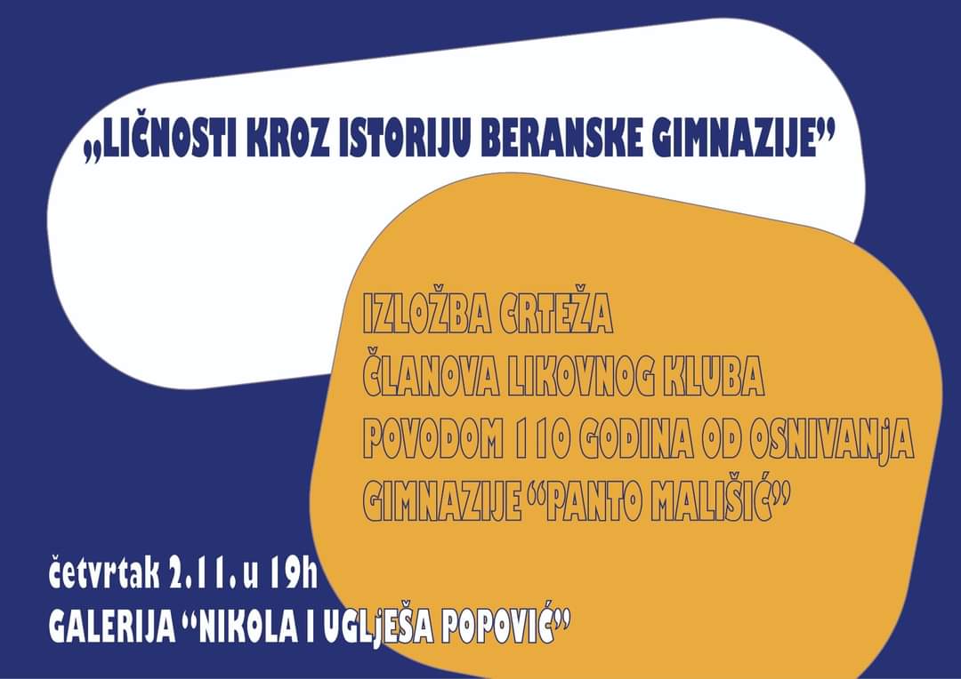 Izložba crteža pod nazivom “Ličnosti kroz istoriju beranske gimnazije” biće otvorena u četvrtak, 02. novembra, sa početkom u 19 časova, u galeriji “Nikola i Uglješa Popović”.