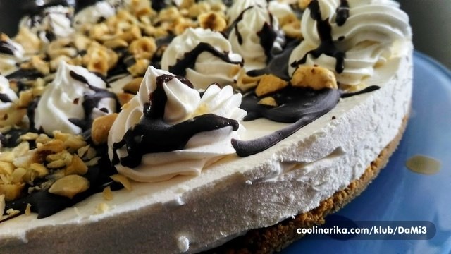 2. U međuvremenu mutiti slatku pavlaku za kolače (tipa Hopla), dodati kondenzovano mlijeko sa ekstraktom vanilije, te lijepo umućenu masu izliti na bazu ,poravnati i staviti u frižider da se stegne. Otopiti čokoladu i maslac, preliti preko zaleđene torte i posuti prepečenim, grubo sječenim lješnicima.