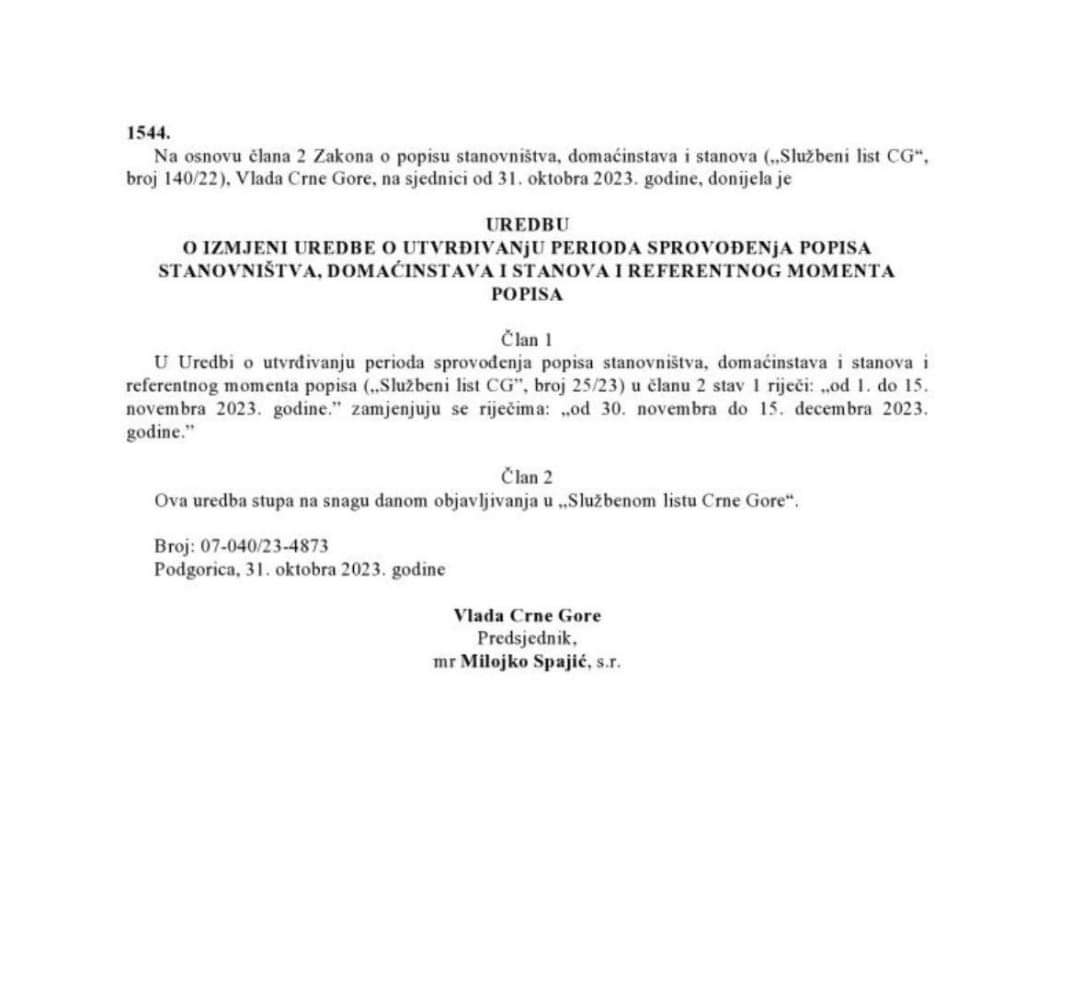 Dodaju da Članom 1. u Uredbi o utvrđivanju perioda sprovođenja popisa stanovništva, domaćinstava i stanova i referentnog momenta popisa („Službeni list CG”, broj 25/23) u članu 2 stav 1 riječi: od 1. do 15. novembra 2023. godine.” zamjenjuju se riječima: od 30. novembra do 15. decembra 2023. godine.