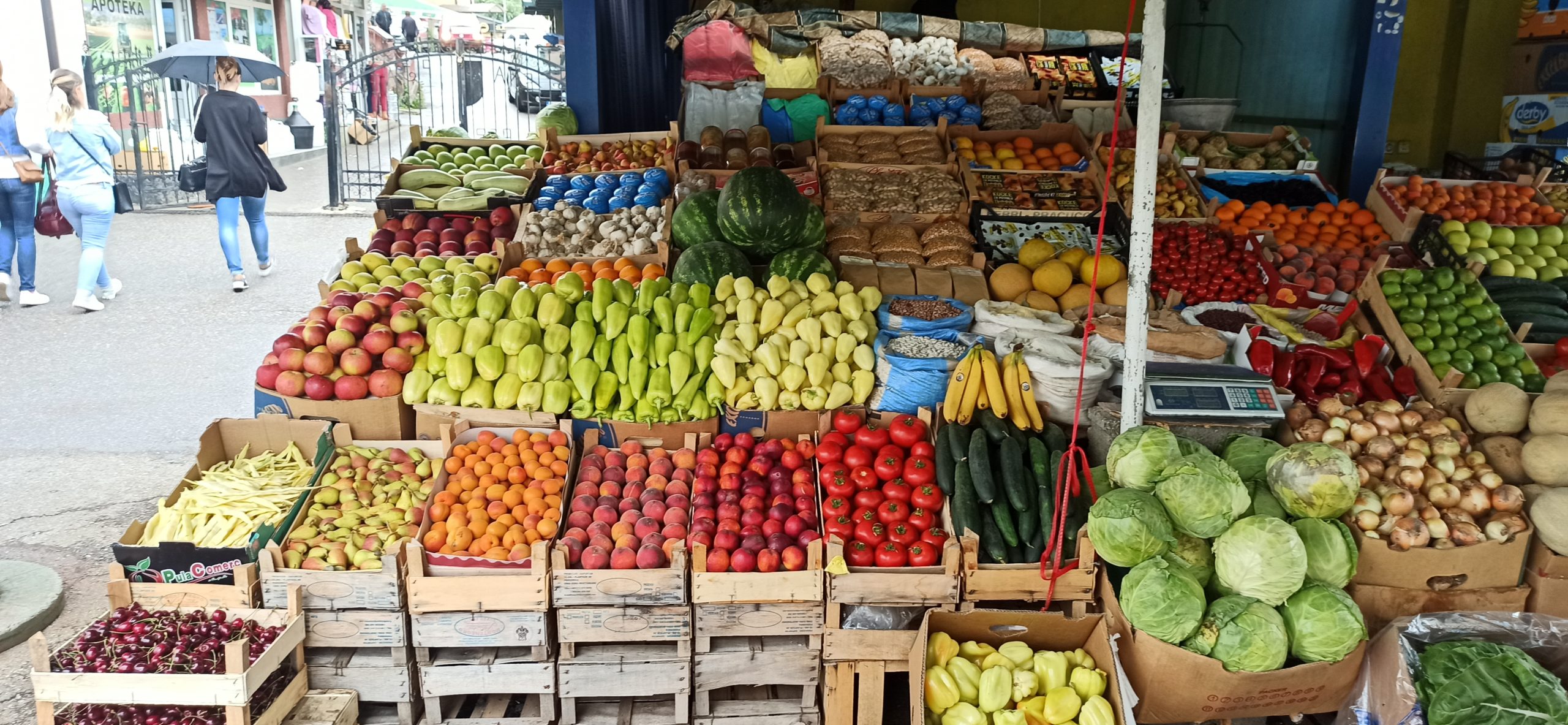 Na pijaci je i ove nedjelje odlična ponuda voća i povrća. Cijene su većinom nepromijenjene, sa par izuzetaka. Smokve su novitet i koštaju 3.00 eura. Pojeftinila je boranija koja sada košta 1.50 eura i krastavac koji košta 0.70 centi za kilogram.