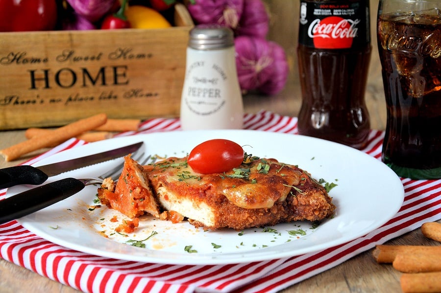 Ukusne pileće šnicle sa parmezanom i mocarelom, prelivene uksnim sosom od paradajza sa bosiljkom koji sjajno ide uz ove šnicle.