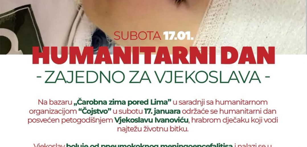 Na bazaru “Čarobna zima pored Lima” u saradnji sa humanitarnom organizacijom “Čojstvo” u subotu 17. januara održaće se humanitarni dan posvećen petogodišnjem Vjekoslavu Ivanoviću, hrabrom dječaku koji vodi najtežu životnu bitku.Vjekoslav boluje od pneumokoknog meningoencefalitisa i nalazi se u određenom stadijumu kome.