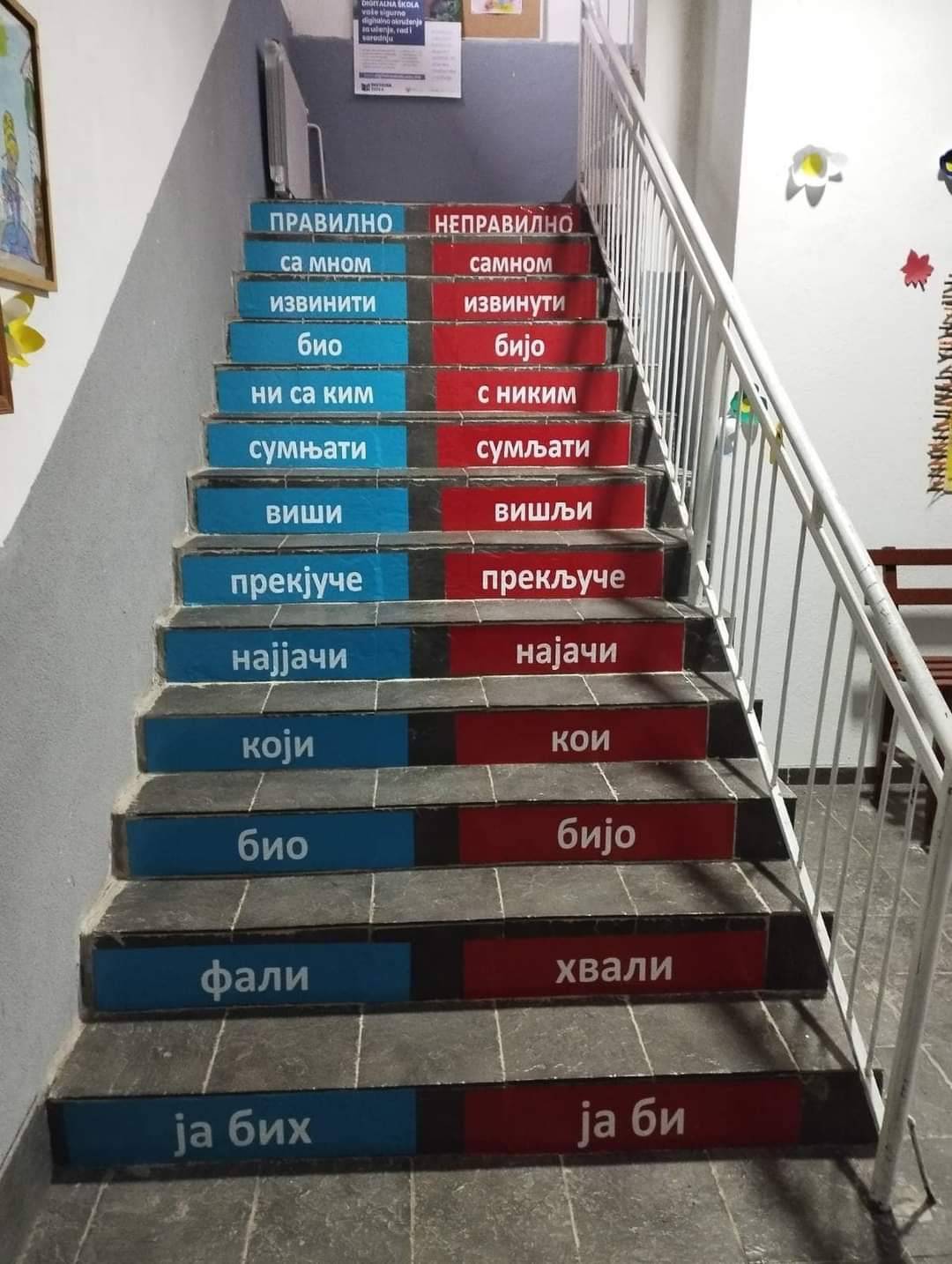 U OŠ “Donja Ržanica” postavljene su “pametne stepenice”- na svakom od stepenika ove škole ispisane su najčešće gramatičke i pravopisne greške i pravilno pisanje istih.