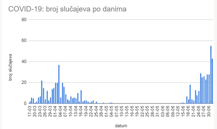 Najviše oboljelih za dan registrovano je prvog jula – 55 slučajeva.
