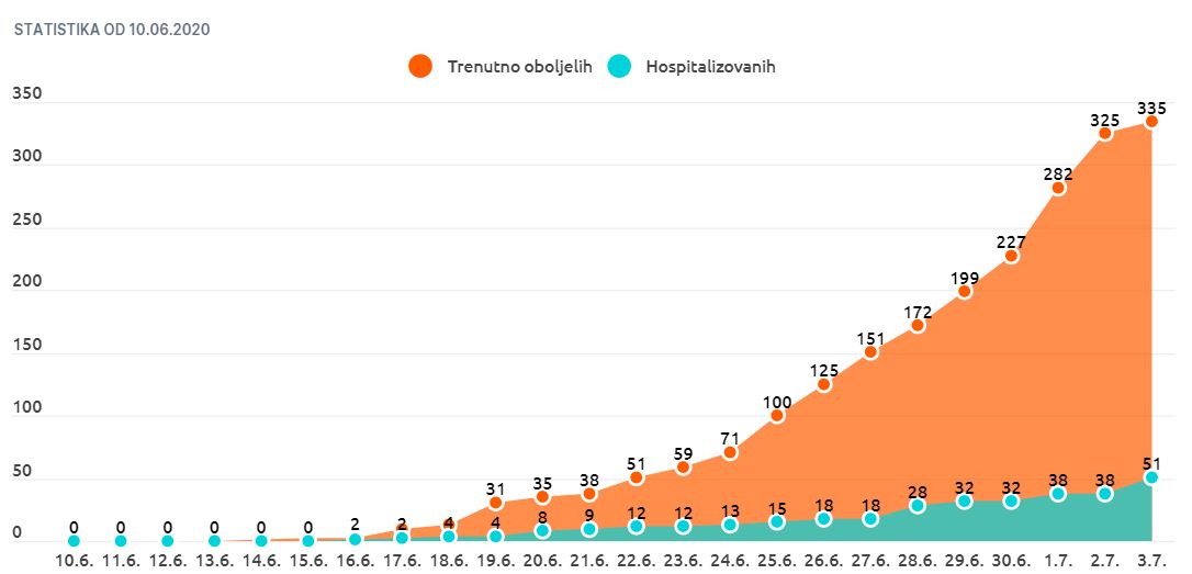 Od početka epidemije, odnosno od pojave prvog slučaja u Crnoj Gori do danas, ukupan broj oboljelih je 663, trenutno oboljelih je 335, hospitalizovane su 54 osobe, preminulo ih je 13, oporavilo se 315, a pod nadzorom je trenutno 2084 ljudi.