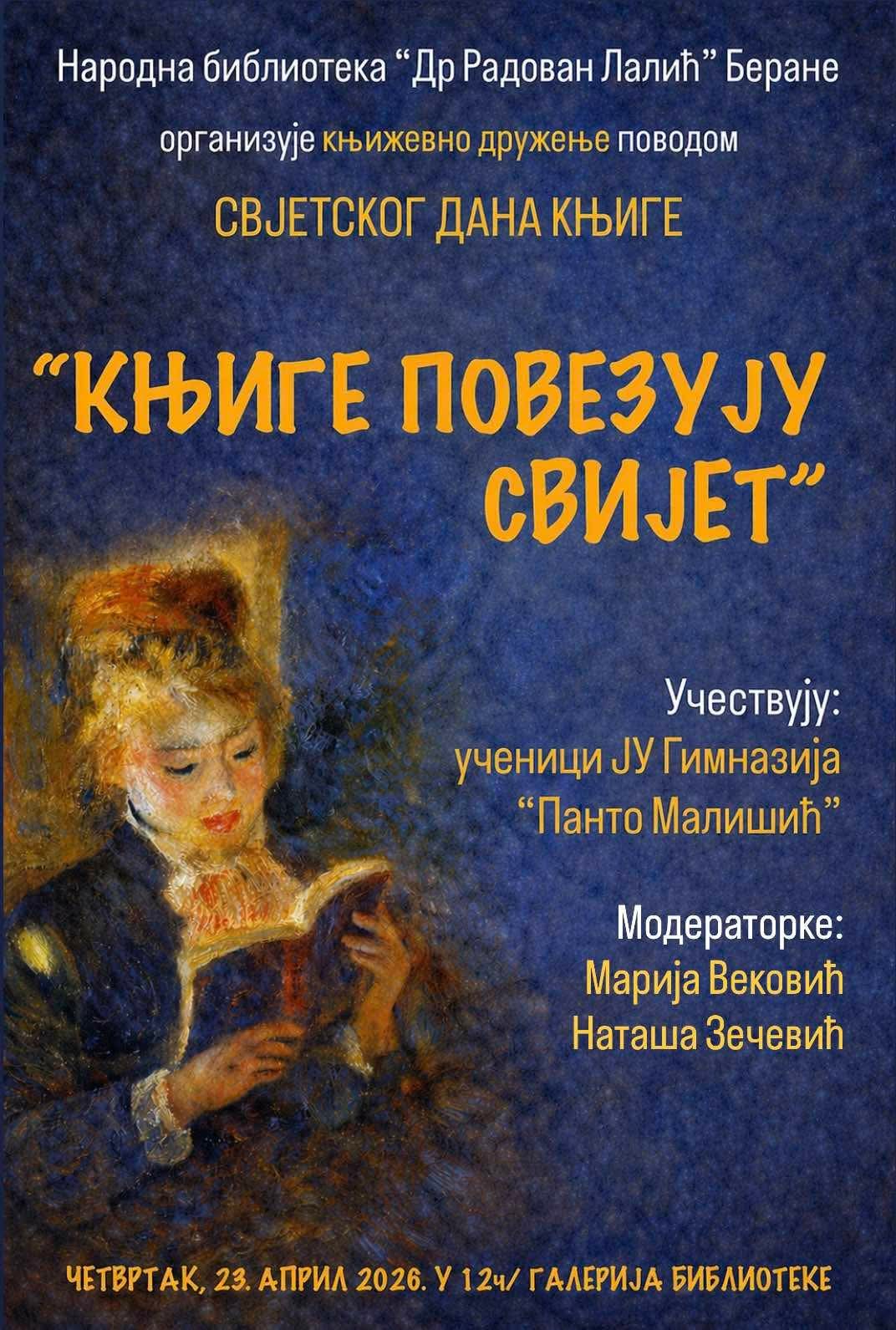 Program povodom Svjetskog dana knjige organizuju Centar za kulturu Berane i Narodna biblioteka “Dr Radovan Lalić”, dok su moderatorice događaja Marija Veković, bibliotekarka, i Nataša Zečević, urednica kulturno – umjetničkih programa.