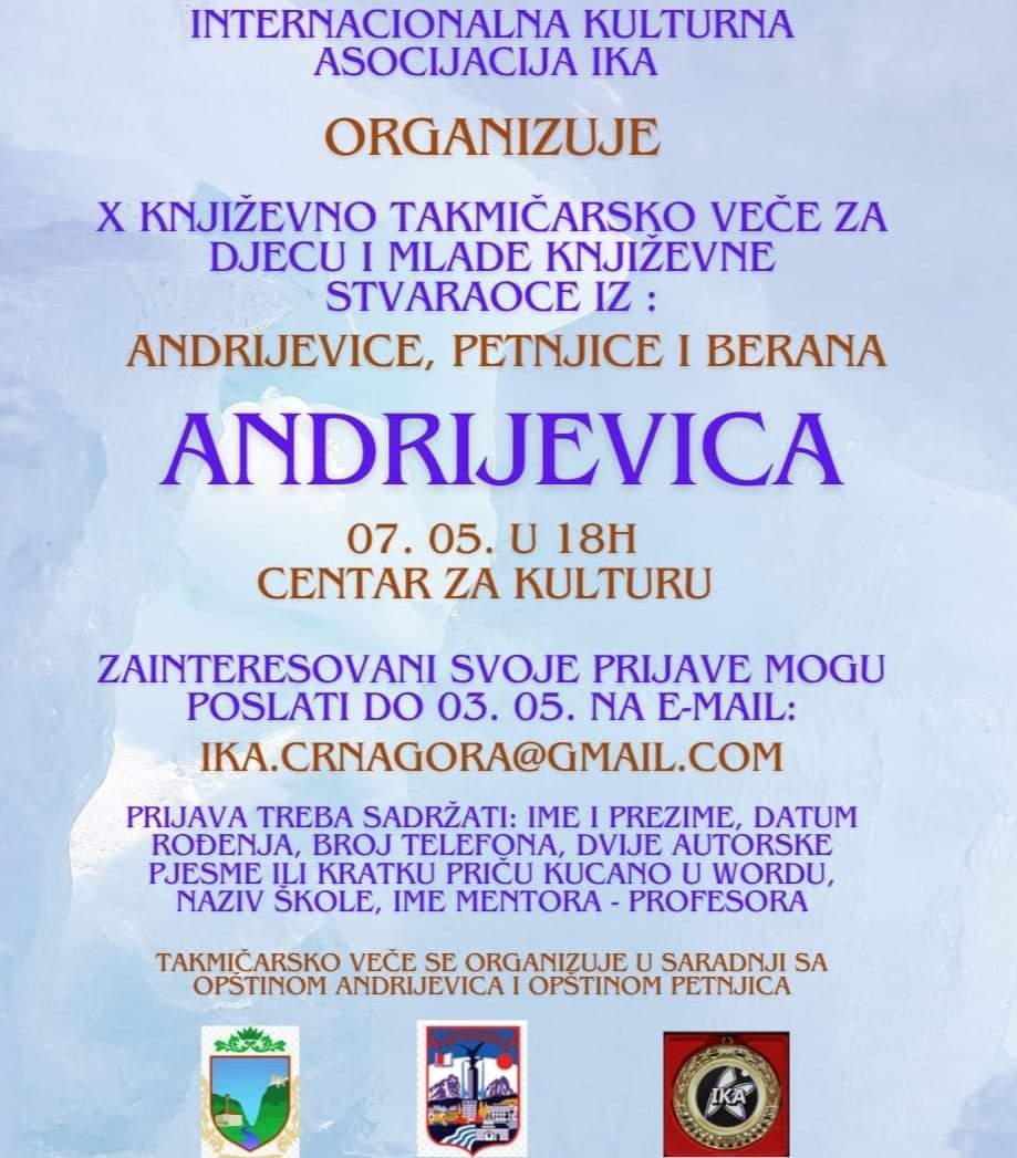 Književno takmičarsko veče za djecu i mlade književne stvaraoce od 10 do 18 godina iz Andrijevice, Berana i Petnjice koje realizuje Internacionalna kulturna asocijacija IKA upriličiće se 07. maja u Centru za kulturu u Andrijevici početkom u 18h.