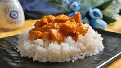 Servirajte tako što na tanjir stavite pirinač, podignete ivice a u sredinu stavite tikka masala piletinu.