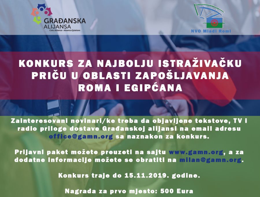 “Građanska alijansa” u saradnji sa NVO “Mladi Romi”, raspisali su konkurs za najbolju istraživačku priču u oblasti zapošljavanja Roma i Egipćana. Poziv je namijenjen svim novinarima i novinarkama koji rade u Crnoj Gori, piše RTCG.