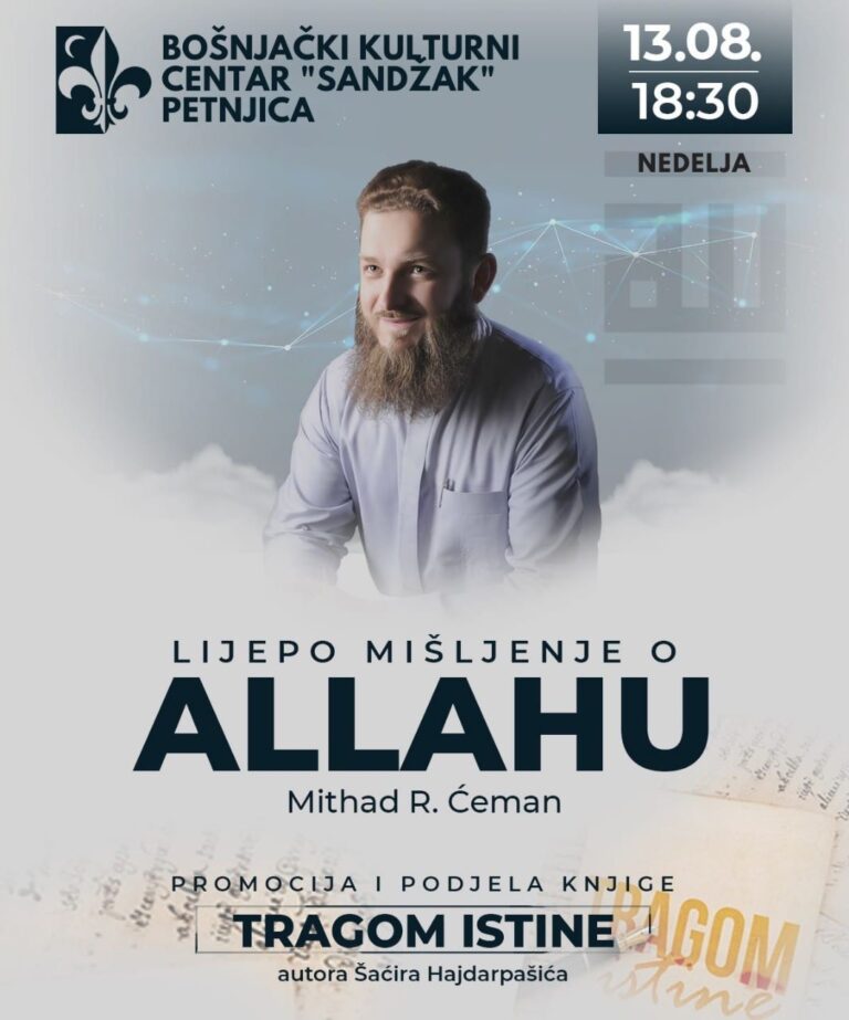 U organizaciji Bošnjačkog kulturnog centra “Sandžak” iz Petnjice 13. avgusta će biti organizovana tribina pod nazivom “Lijepo mišljenje o ALAHU” na kojoj će govoriti Mithad R. Ćeman.