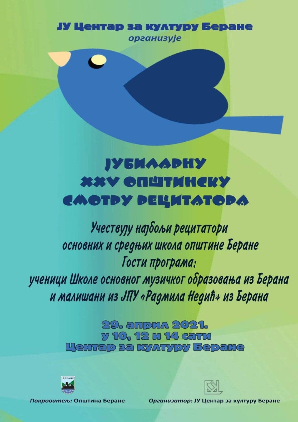 Jubilarna XXV-a Opštinska smotra recitatora biće održana u četvrtak, 29. aprila, u Centru za kulturu koji je ujedno i organizator ove manifestacije.