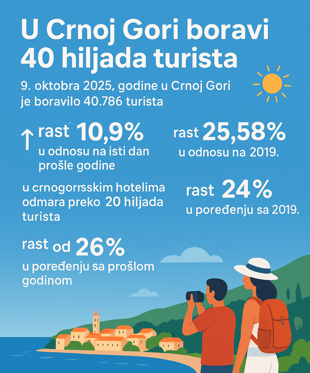 Na osnovu nezvaničnih podataka o turističkom prometu u opštinama, koje dostavljaju lokalne turističke organizacije, 9. oktobra 2025. godine u Crnoj Gori je boravilo 40.786 turista, što predstavlja rast od 10,9% u odnosu na isti dan prethodne godine i rast od 25,58% u odnosu na uporedni period 2019. godine.