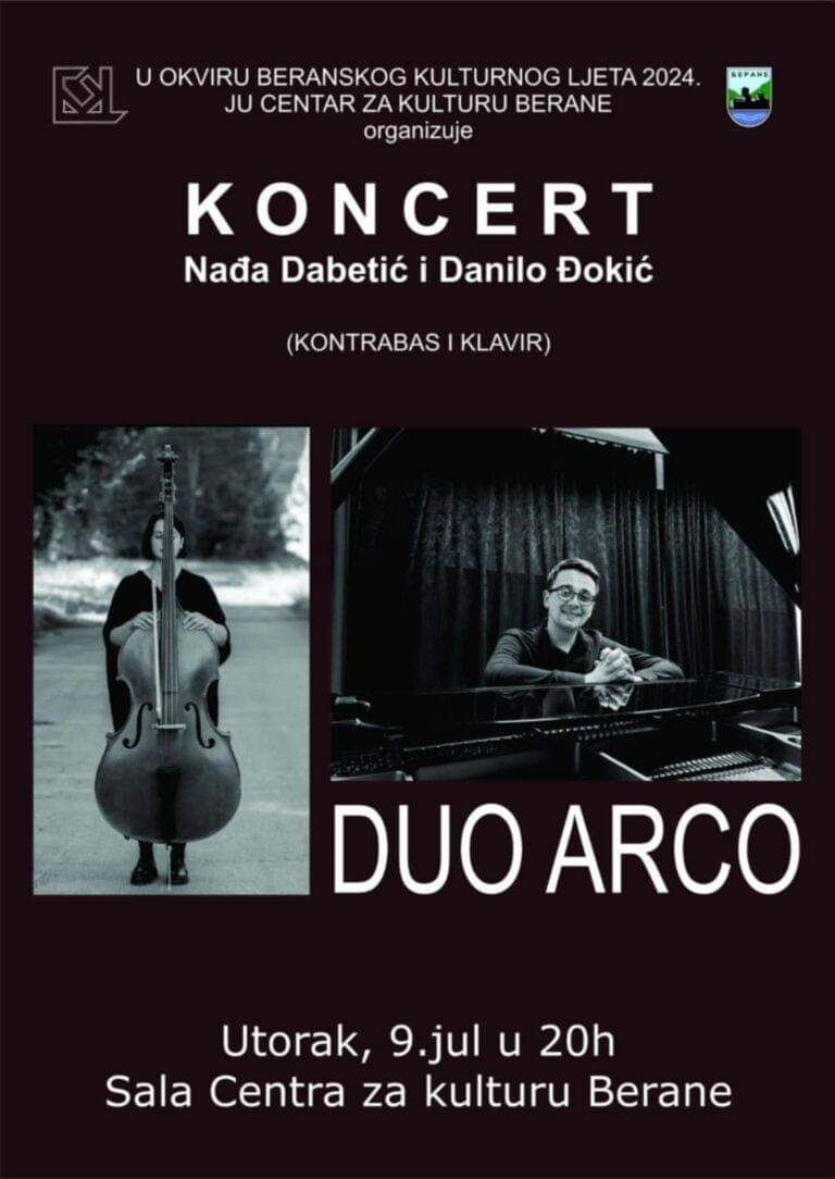 U okviru „Beranskog kulturnog ljeta 2024.“ u organizaciji JU Centar za kulturu Berane, koncert dua “Arco“ na kome će se predstaviti umjetnici Nađa Dabetić (kontrabas) i Danilo Đokić (klavir) zakazan je za utorak, 9. jul 2024. godine u 20 časova, u beranskom Centru za kulturu.