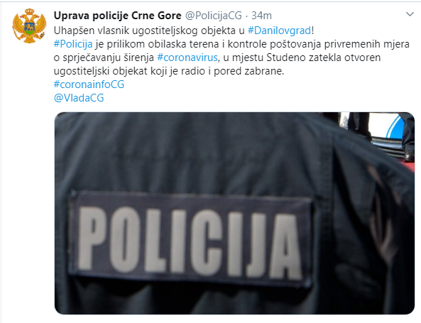Uprava policije saopštila je na svom twitter nalogu da je danilovgradska policija uhapsila vlasnik ugostiteljskog objekta Z.K.. Oni su prilikom kontrole zatekli otvoren lokal uprkos zabrani.