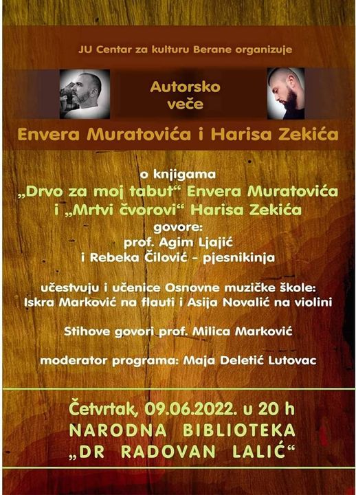 JU Centar za kulturu Berane organizuje autorsko veče Envera Muratovića i Harisa Zekića u četvrtak, 09. 06. 2022. godine u Narodnoj biblioteci „Dr Radovan Lalić“ sa početkom u 20 časova.