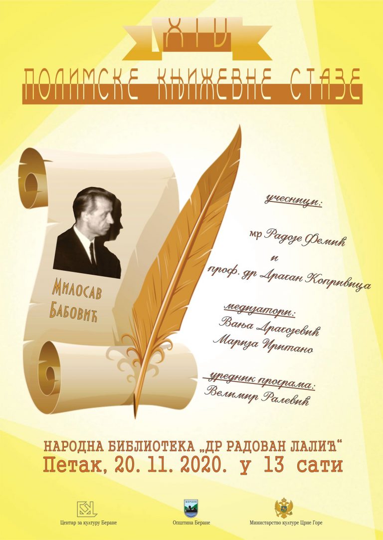 O životu i djelu Milisava Babovića govoriće prof. dr Dragan Koprivica i mr Radoje Femić, medijatori su Vanja Dragojević i Marija Iritano, a urednik programa je Velimir Ralević.