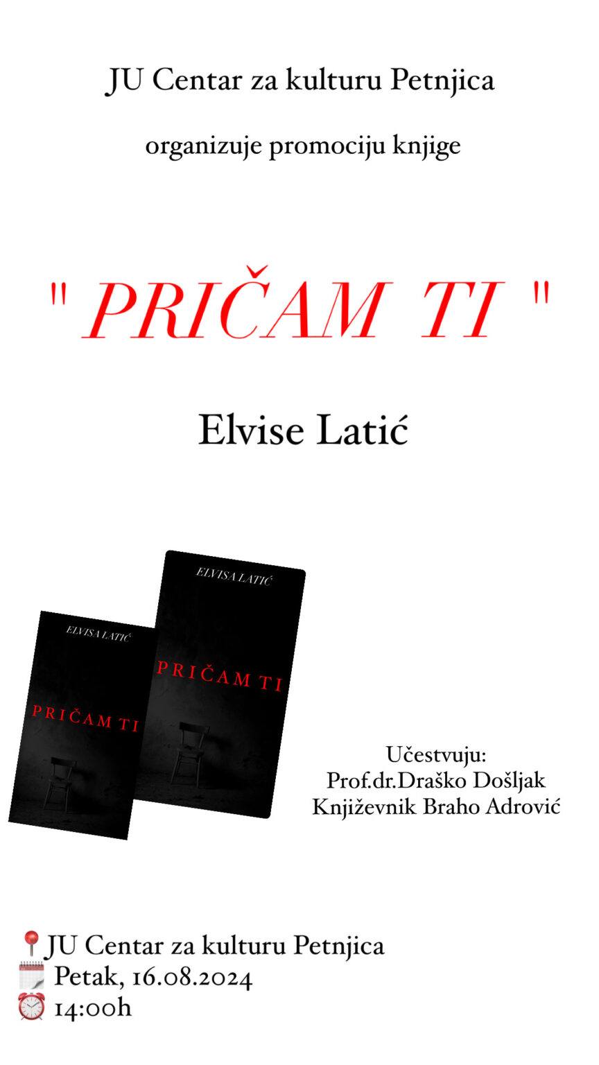 Autorka Elvisa Latić će u JU Centar za kulturu Petnjica održati promociju knjige “Pričam ti”, u petak, 16. avgusta sa početkom od 14 časova.
