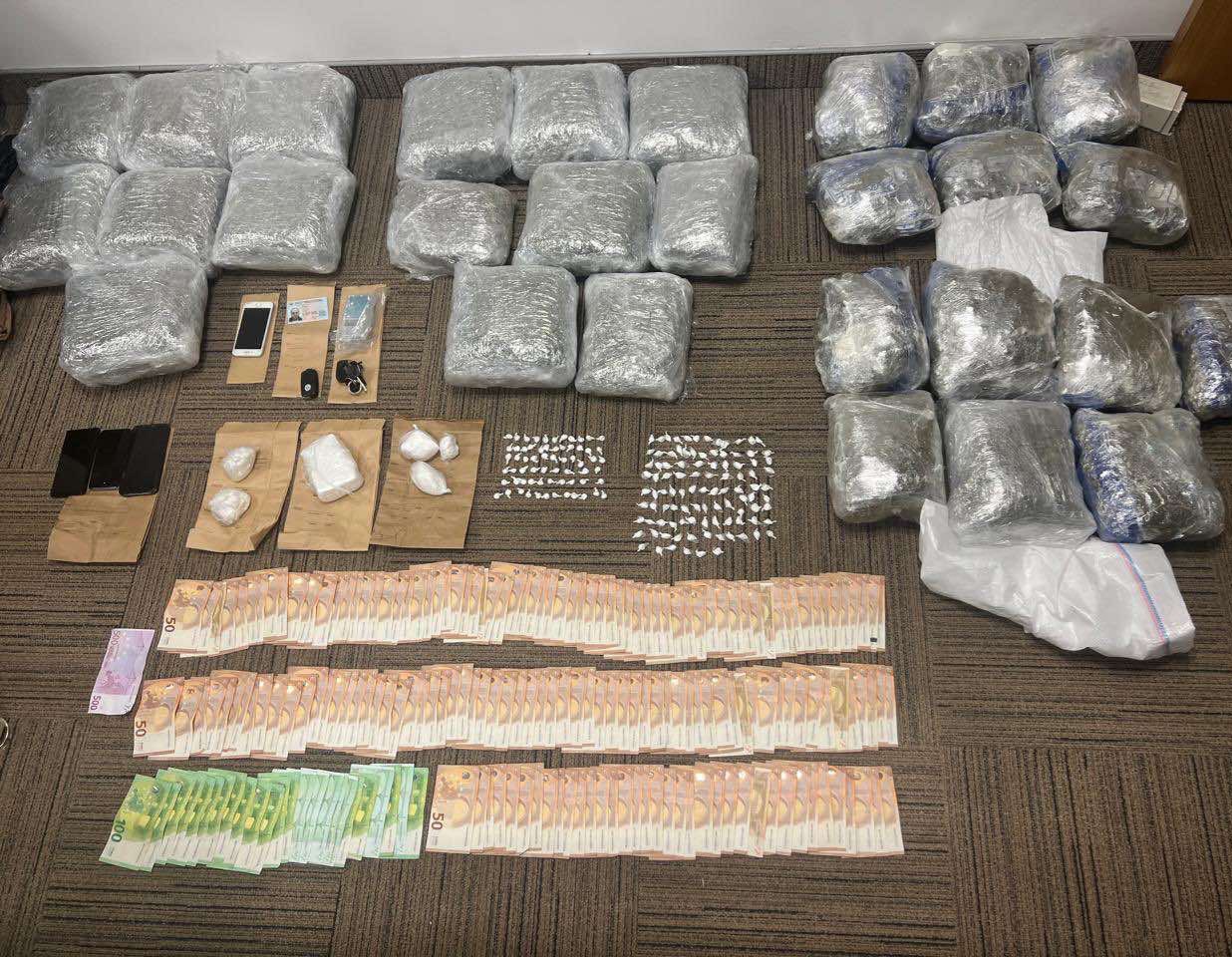Pretresom je pronađena i oduzeta biljna materija za koju se sumnja da je opojna droga marihuana, težine oko 30 kilograma, praškasta materija za koju se sumnja da je kokain, težine oko 650 grama, novac u iznosu od 11.400 eura, a za koji se sumnja da je stečen prodajom narkotika, kao i četiri mobilna telefona od kojih jedan sa kripto zaštitom”, saopštili su iz Uprave policije.