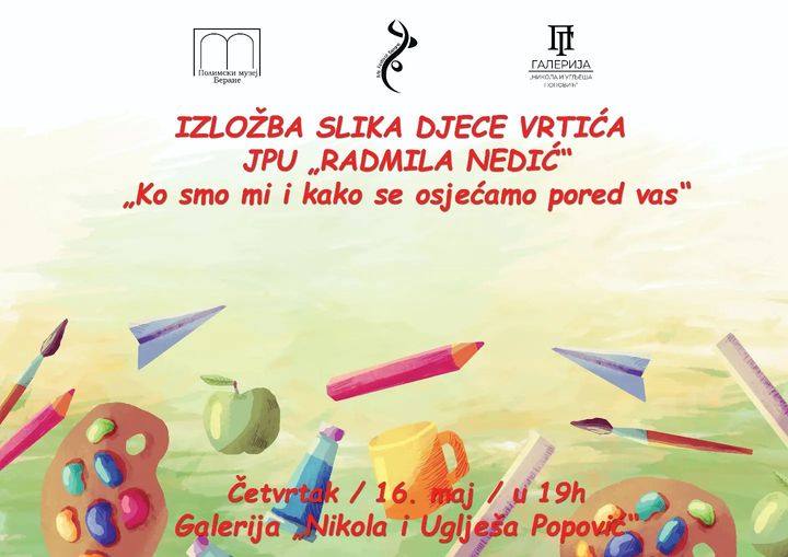 U četvrtak, 16. maja, u galeriji ,,Nikola i Uglješa Popović”, sa početkom u 19 časova, biće otvorena izložba slika djece vrtića JPU ,,Radmila Nedić” pod nazivom ,,Ko smo mi i kako se osjećamo pored vas”.