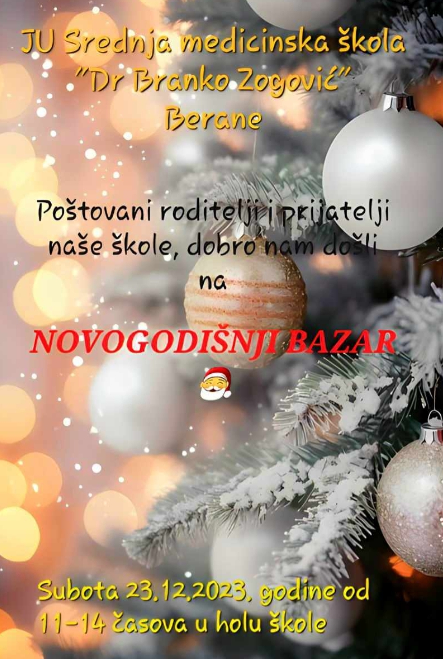 U organizaciji profesora praktične nastave, ove godine će učenici Srednje medicinske škole (SMŠ) “Dr Branko Zogović, u subotu, 23. decembra, u holu škole, u periodu od 11 do 14 časova, održati novogodišnji bazar.