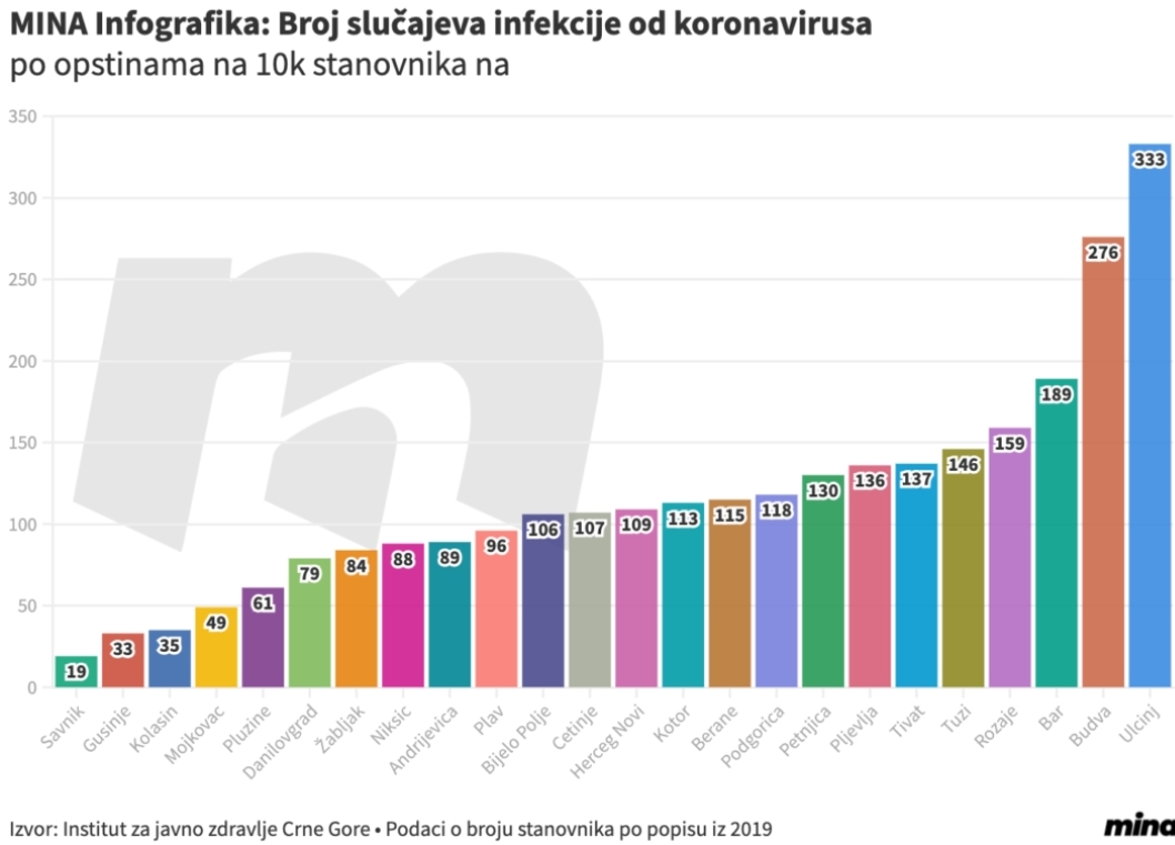 U Ulcinju su registrovana 333 zaražena na deset hiljada stanovnika, Budvi 276, Baru 189, Rožajama 159, Tuzima 146, Tivtu 137, u Pljevljima 136.