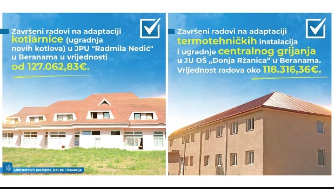Završeni su radovi na adaptaciji kotlarnice i termotehničkih instalacija u JPU “Radmila Nedić” i JU OŠ “Donja Ržanica” u Beranama, saopšteno je iz Ministarstva prosvjete.